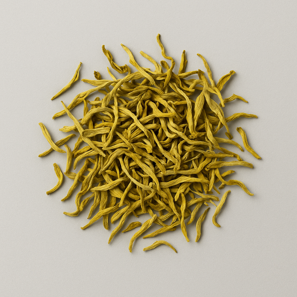 Жёлтый чай с горы Тяньтай. Мягкий и сладковатый вкус с ореховыми и цветочными оттенками.